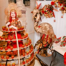 Юлия подготовила фотозону в русском народном стиле, и эта зона была очень колоритна. Для нее использовали стилизованные акценты – хохлома, самовар, ковка, кокошник и наряды.