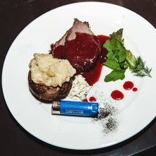 филе лося томленое при низкой температуре/соус из черной смородины/ печеный картофель с кедровым молоком/сыр страчатела/