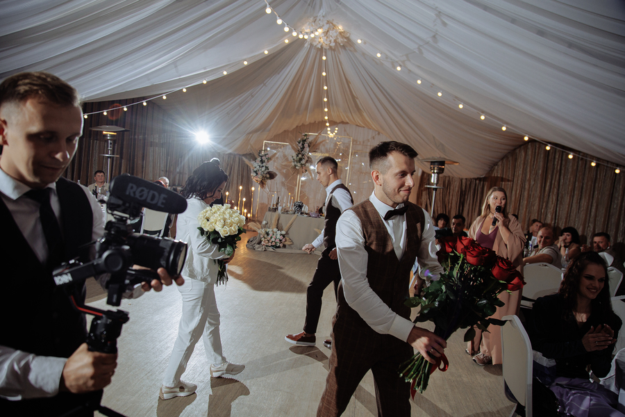 В ходе программы ведущих нам понравилось поздравление родителей, кино-шоу "Зеленка", ненавязчивое общение с гостями, поддержание хорошего настроение весь день и проведение свадебной церемонии.»