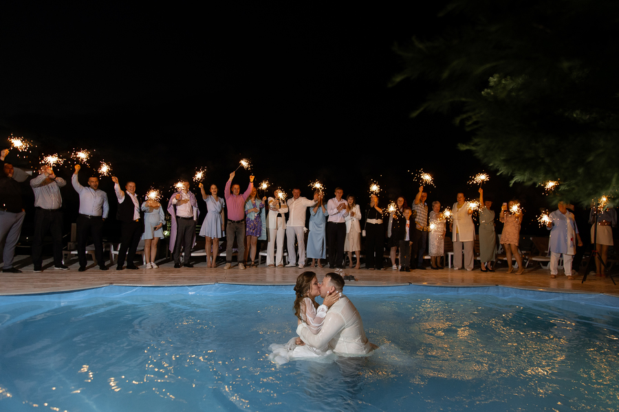 В программе нашего свадебного банкета мы запомнили поздравления родных и друзей. Прыжок в бассейн. Легкость в работе с фотографом Олей, видеографом Валентином, поддержка координатора Валентины и вся работа со Светланой.