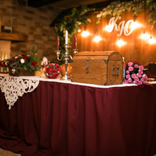 Банкет…. Он был особенным во многих смыслах. Начнем с оформления. Место банкета таверна "Медвежья лапа". Я большой фанат дерева, и я очень хотела дерево задействовать у нас на свадьбе. Поэтому наш президиум был деревянным с живой зеленью.