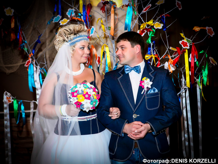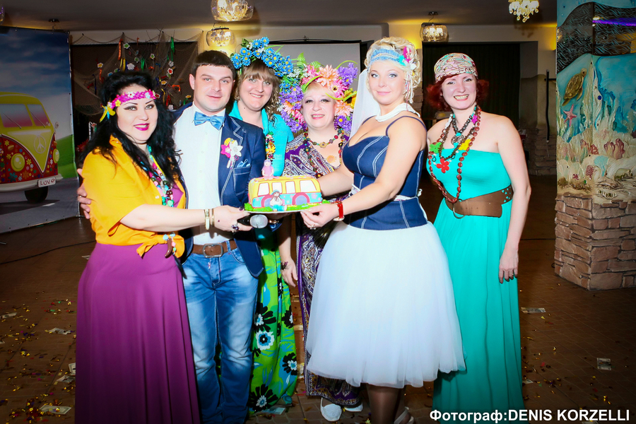 Сама свадьба была очень крутая. Необычная тематика – новая для искушенных ведущих типа нас: хиппи, очень всех завела. Тему выбирали мы сами! Главный критерий был: свадьба не как у всех! А только наша такая! Все гости молодцы, сразу видно творческие люди, дресс код был соблюден на все сто процентов! Организаторы оформили зал в соответствии с тематикой, подготовили торт тематический, была стилизованная выездная регистрация с обменом кольцами в виде бабочек…Было реальное погружение в хиппи атмосферу. С Братска с нами поехали наши друзья: наши звукооператоры – Борис и Иван, фотограф: Denis Korzelli, видеографы: Сергей и Ольга Зарубины, а также наша любимая ведущая Юлия Семенишина. Их поддержка нам очень помогла. Благодаря им свадьба получилась душевной. Все как по-настоящему. Мы как реальные молодые готовили необычный постановочный танец молодых под тематическую музыку. А еще готовили дистанционно по скайпу флешмоб с нашими дружками и подружками!