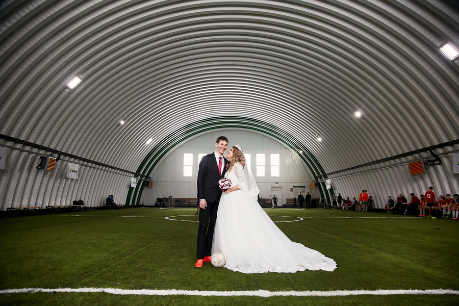 Поэтому на свадьбе в тот день 25 февраля все складывалось просто до неприличия идеально. Это, знаете, когда реальность превосходит ожидания. Даже погода в этот день выдалась удивительно безветренной для февраля. Кстати, фотосессия молодых в день свадьбы проходила не только на свежем воздухе, но и на футбольном поле, ведь жених наш – футболист.