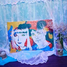 Неожиданное для нас было трогательное поздравления от родителей, от сестры, было очень приятно, эмоции распирали от этих слов. Слова тронули до глубины души. Так же не ожидали такой подарок от организаторов нашей свадьбы - эта замечательная картина (наш портрет).